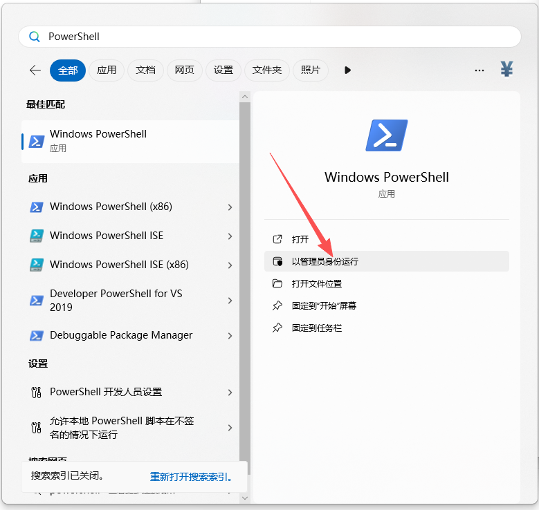 2)WIN键,在弹出搜索中搜索“PowerShell”,「以管理员身份运行」
