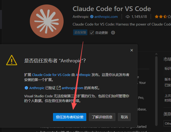 搜索关键字 Claude Code 可以看到第一个Claude Code for VS Code,注意有官方认证的Anthropic,点击「安装」