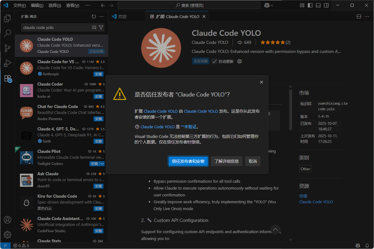 搜不到 “claude code yolo” 使用关键词 “claude-code-yolo” 或离线 .vsix 安装包