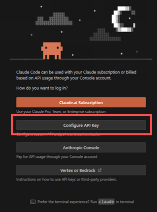 打开 VS Code,进入Claude Code,点:Configure API Key