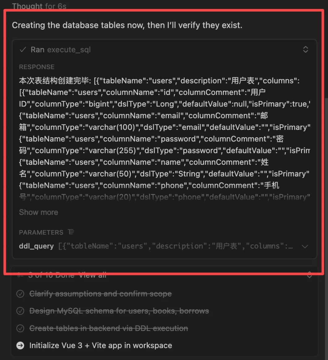 AI 在生成时甚至能自动为这些功能创建数据库,并在后台完成数据表持久化。