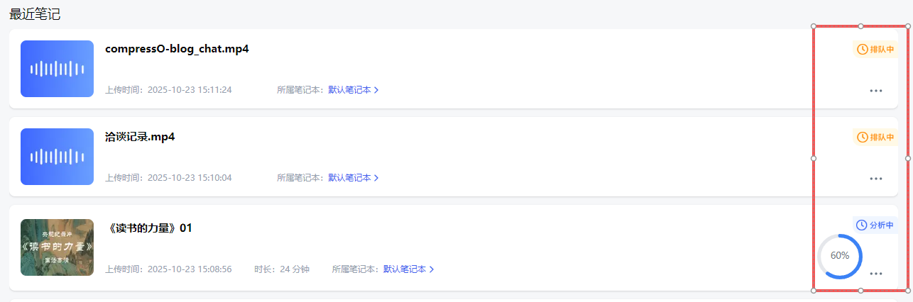 有四种创建笔记的方式:链接解析、本地上传、在线录制、网盘上传