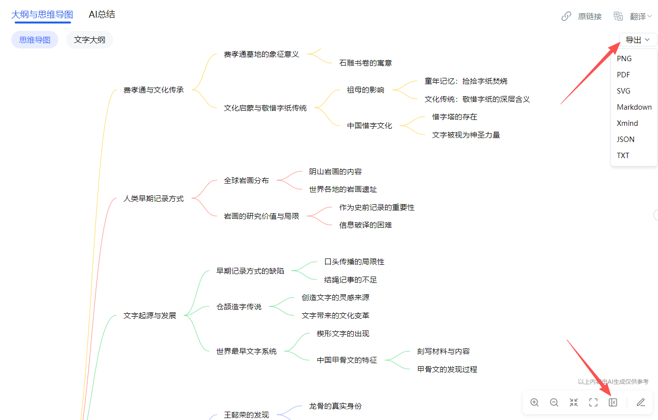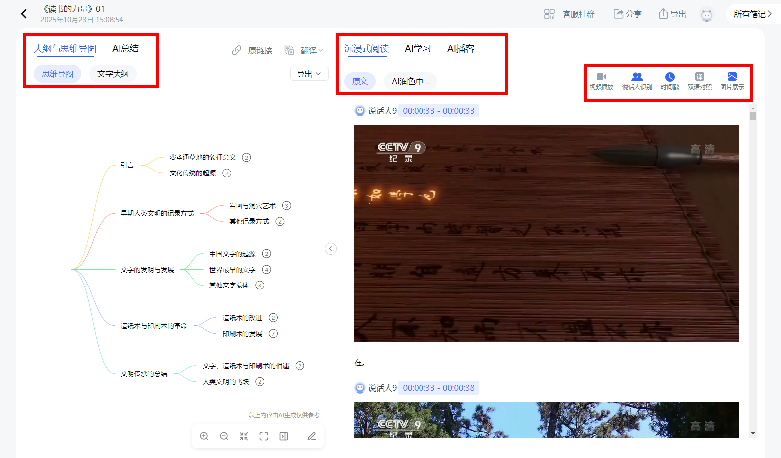 转录后的内容不仅能生成纯文本,还能以 图文笔记、思维导图、AI总结、对话式播客 等多种形式呈现。