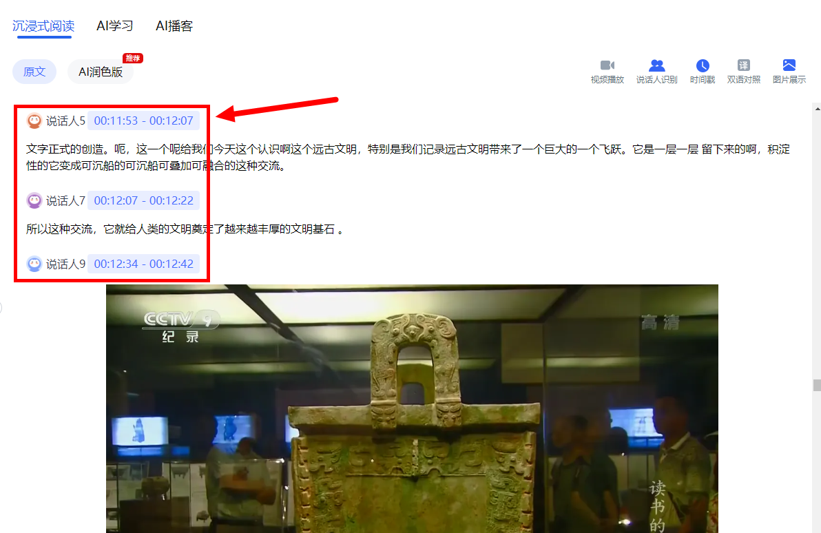并且能标记出时间,而且能够根据时间点截图,这一点是我之前做工作流的时候解决不了的一个问题,这里能够很好的展示出来,对于对话类音视频非常有帮助