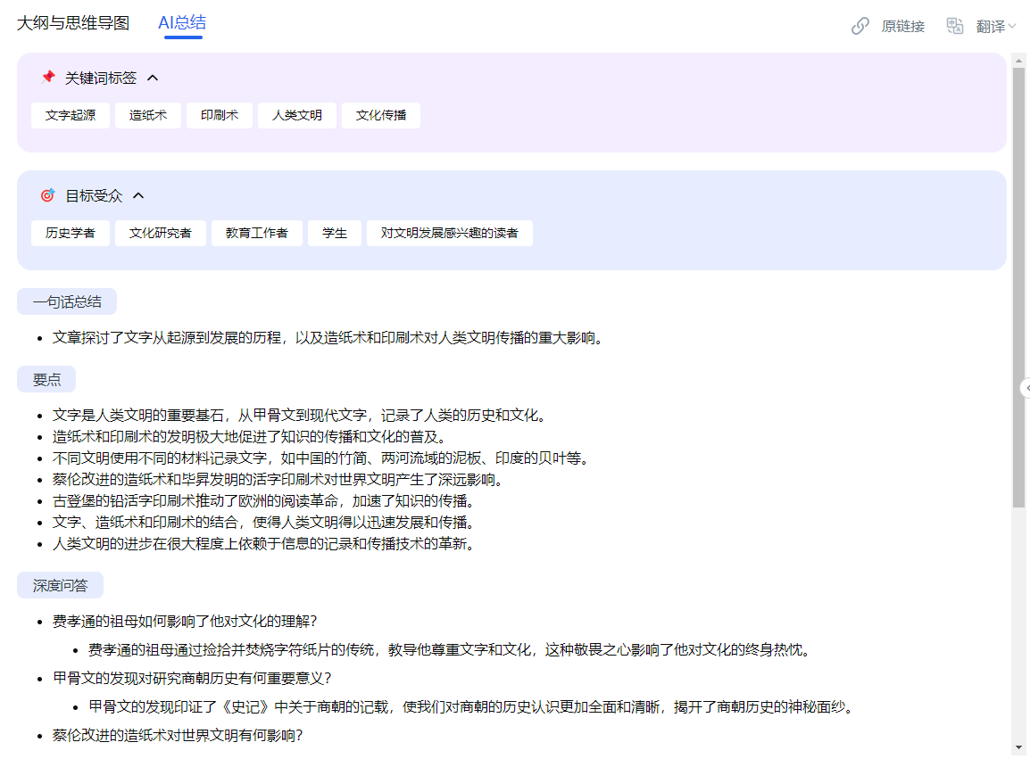 AI总结能够一键提炼音视频核心观点与关键词,提供关键词标签、目标受众、深度问答、术语解释等,这一点非常不错,相当于速读了。