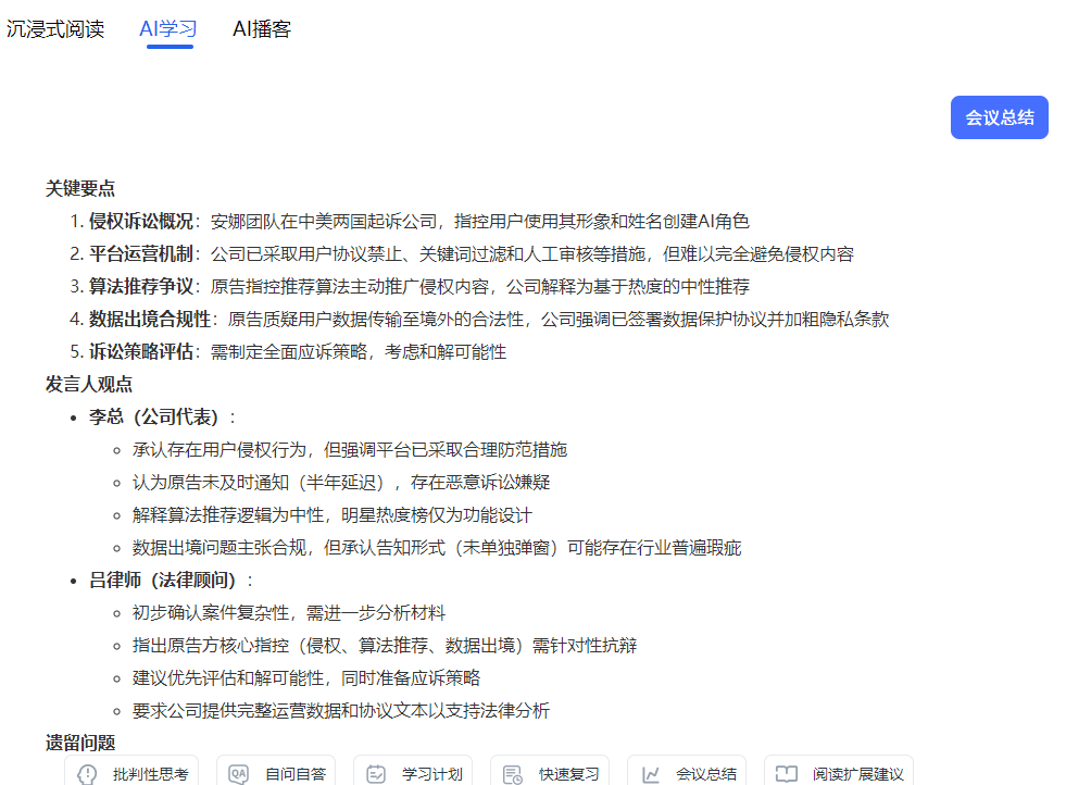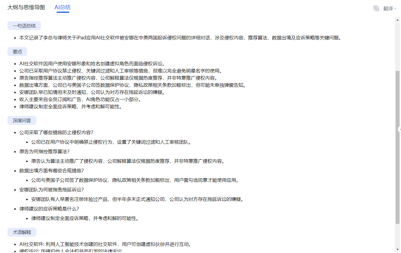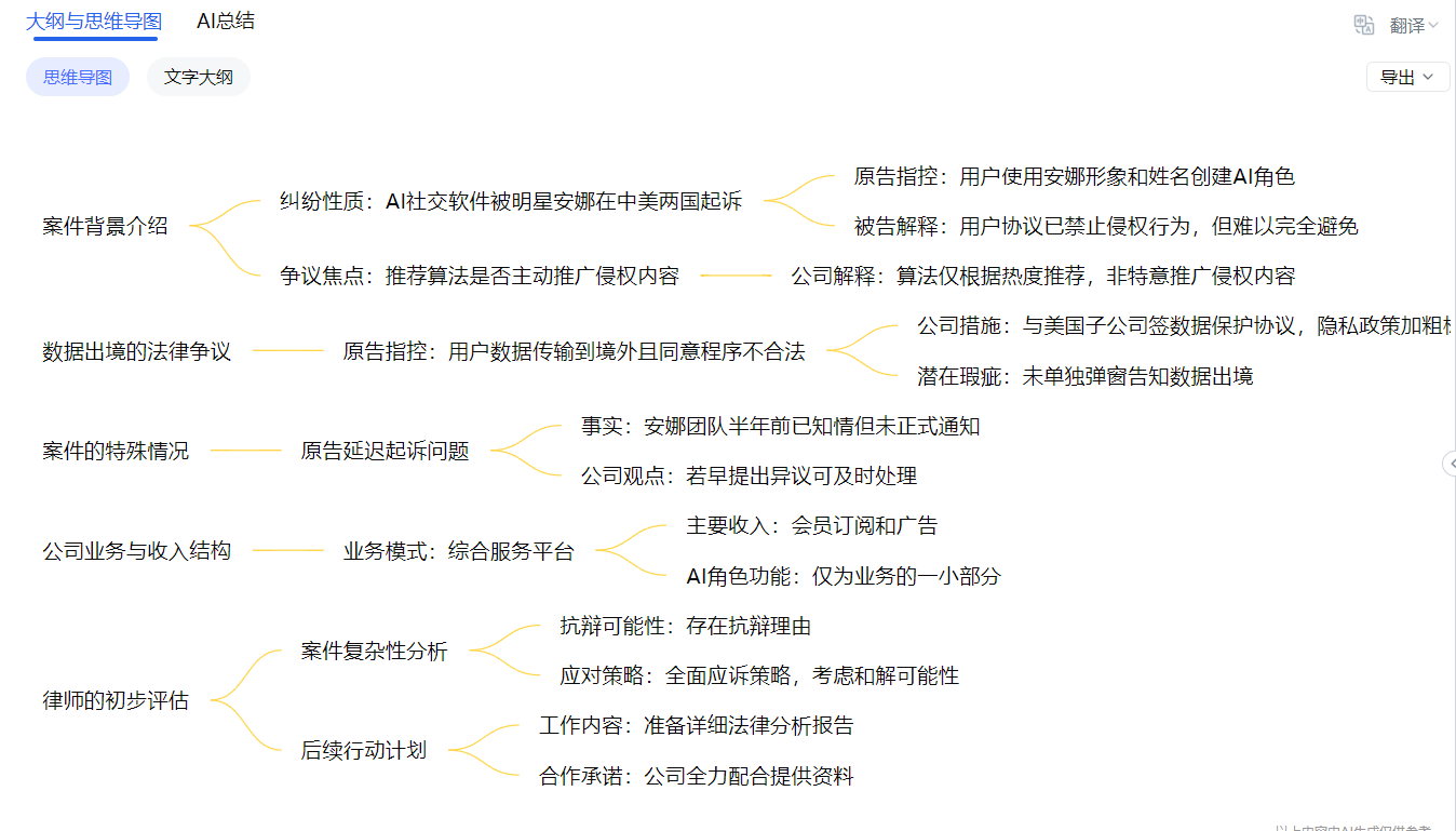 说话人和时间点都能精确识别出来,并且思维导图识别出了谈话中提到的案件背景、法律争议及评估等关键信息,对于日常工作的资料整理非常有帮助