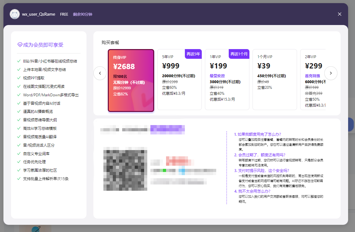 再来说说产品定价:199一年的价格不算高,像国外的AI大模型月费就是20刀起步了,但实际限制了3000分钟时长,这个对于使用频率高,长视频的用户来说,可能30-50个视频就用完了。