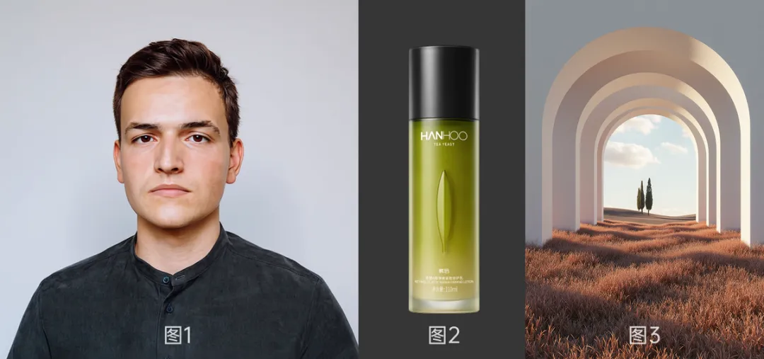 “让图1的模特,拿着图2的绿色护肤品,对着镜头展示,背景是图3。”