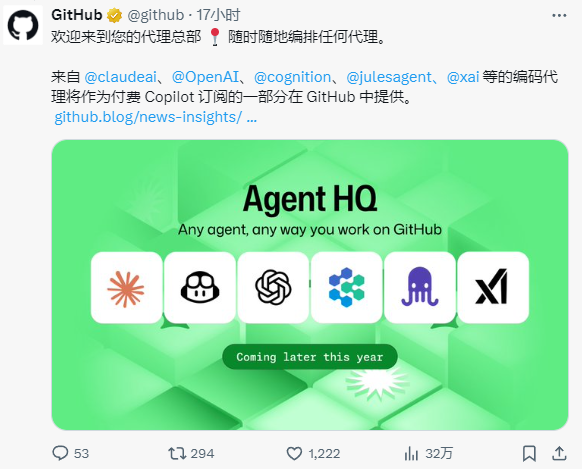 GitHub 搞了个大动作:发布 Agent HQ,一个 Copilot 订阅,就能使用 Claude Code、OpenAI Codex、Google Jules、Cognition、xAI 这些主流 AI 编程 Agent。之前需要到不同 AI 厂商订阅的各种 AI 服务,现在一个 Github Copilot 订阅就全部解决了,真是要逆天了!