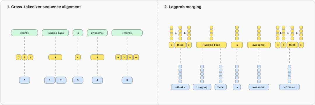 序列对齐:不再简单截断到最短长度,而是识别需要合并的 token,通过对数概率求和来合并语义相关的片段。这样"Hugging"和" Face"可以合并成一个完整的概念。