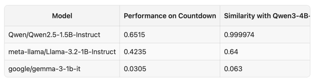 同时需要指出的是,分词器相似度确实影响效果,但仍然强于强化学习。Llama-3.2-1B 与 Qwen3-4B 的相似度 0.64,最终成绩 0.42;Gemma-3-1b 相似度只有 0.063,表现相应较差。