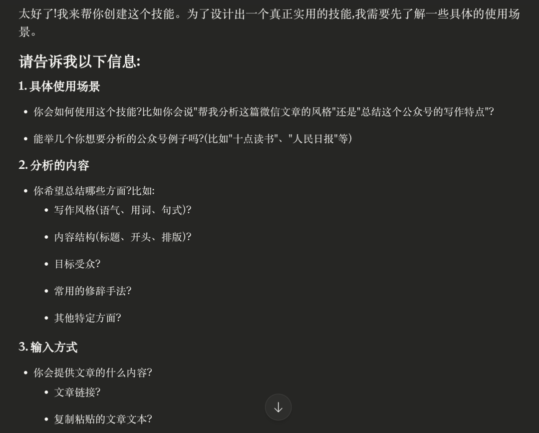 对话示例:"我想创建一个用于分析微信公众号文章写作风格和特点的技能,帮我提炼风格要素和目标受众特征。"