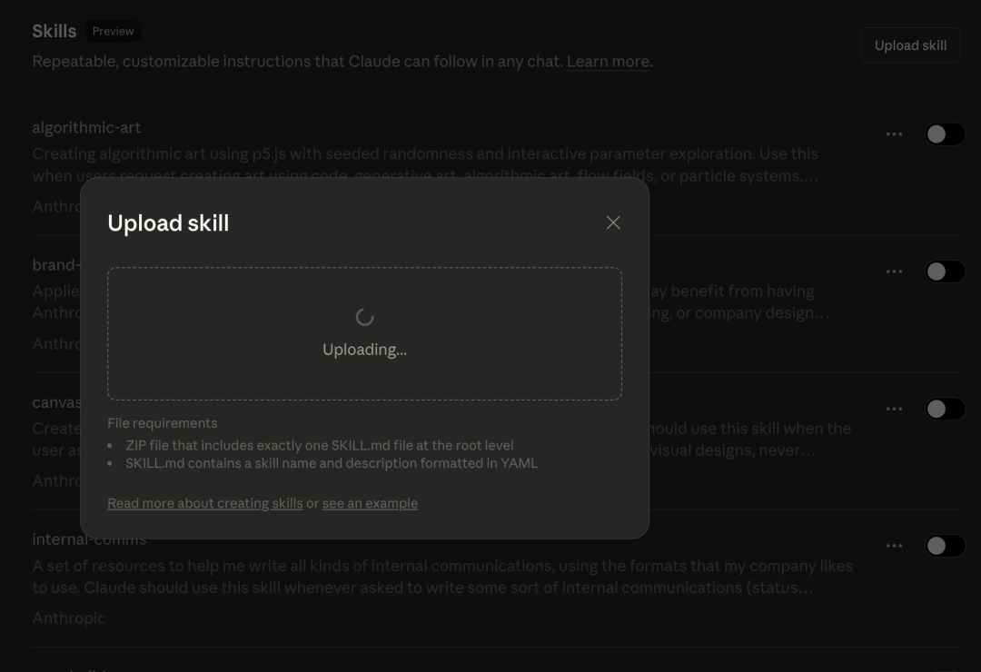 - 流程:上传背景文档 → 描述需求 → 多轮对话确认 → Claude生成完整.skill文件