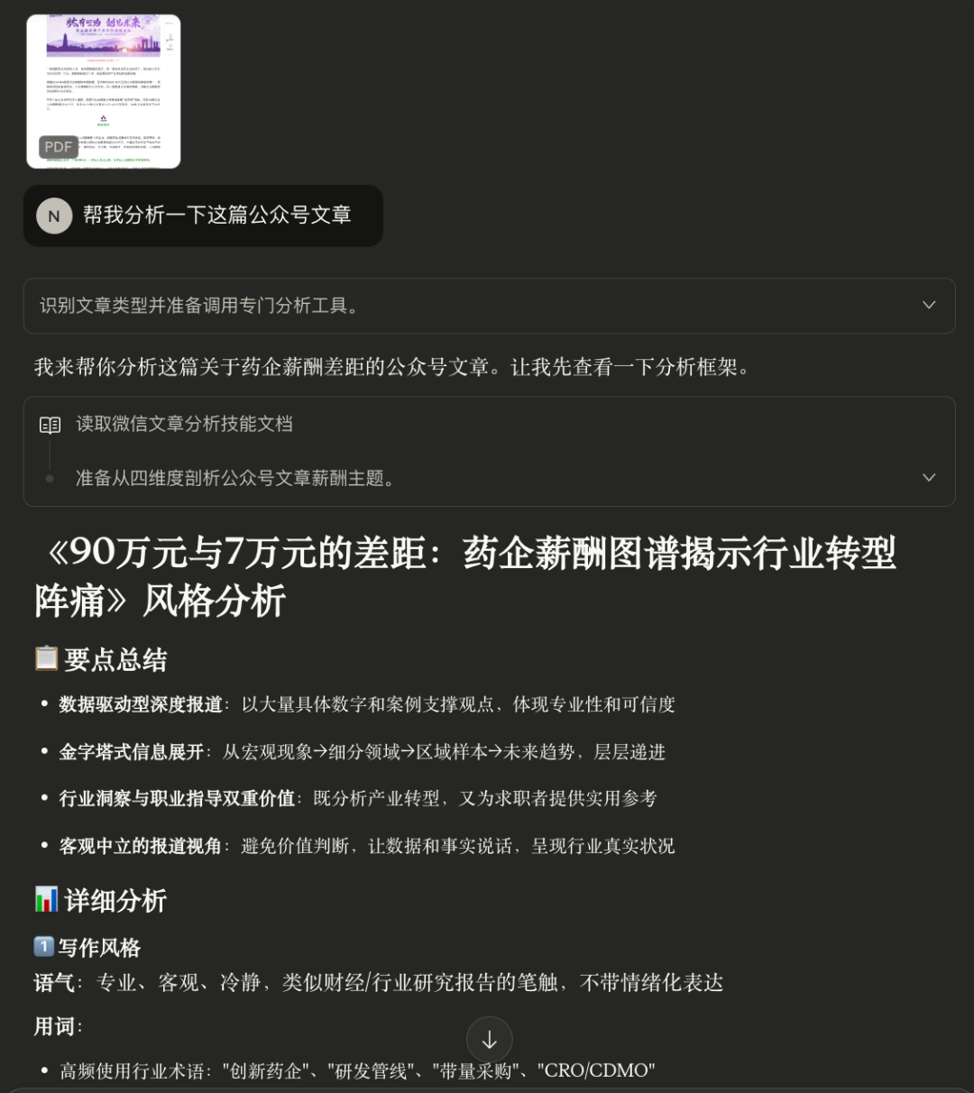 - A: "提供文章内容或截图,询问'帮我分析这篇文章的风格'或'总结这个公众号的写作特点'"