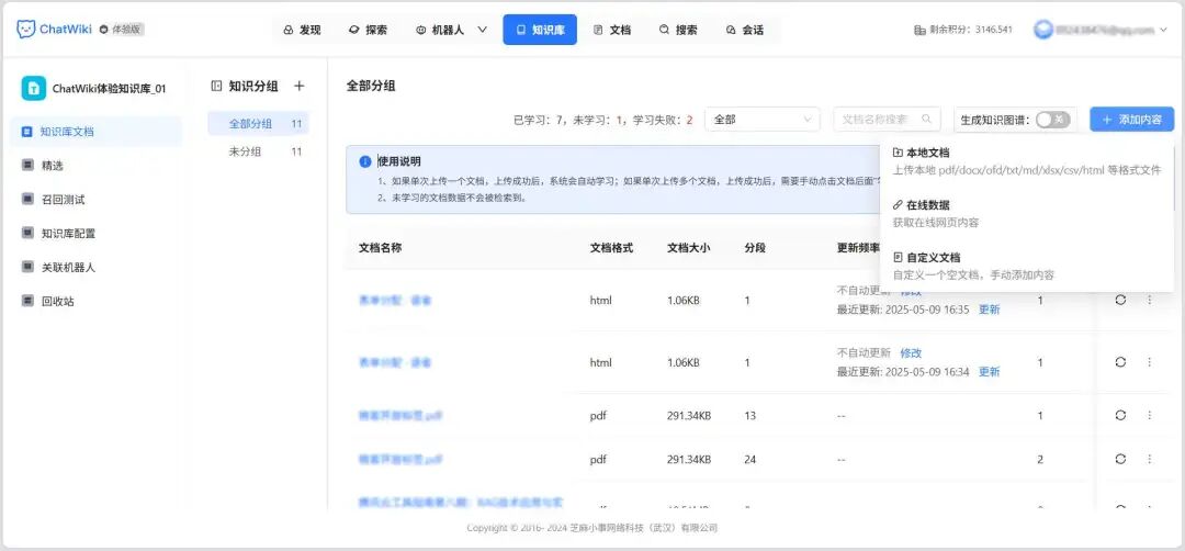 | 知识库系统 | 支持 PDF、Word、OFD、CSV、HTML 等多格式导入;支持 AI 分段、QA 分段、知识图谱构建;向量混合检索 | 构建公众号素材库、产品手册库、常见问题库等 |