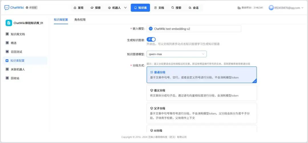 文档知识库: 支持 url 读取、文档批量导入、API 对接、支持AI分段、QA分段、父子分段。支持知识图谱、向量混合检索,可视化查看知识图谱。