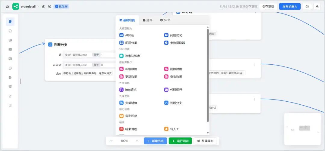 工作流编排: 对话工作流、插件工作流,包含基础的工作流节点、双向 MCP、Agent 模式、用户交互。