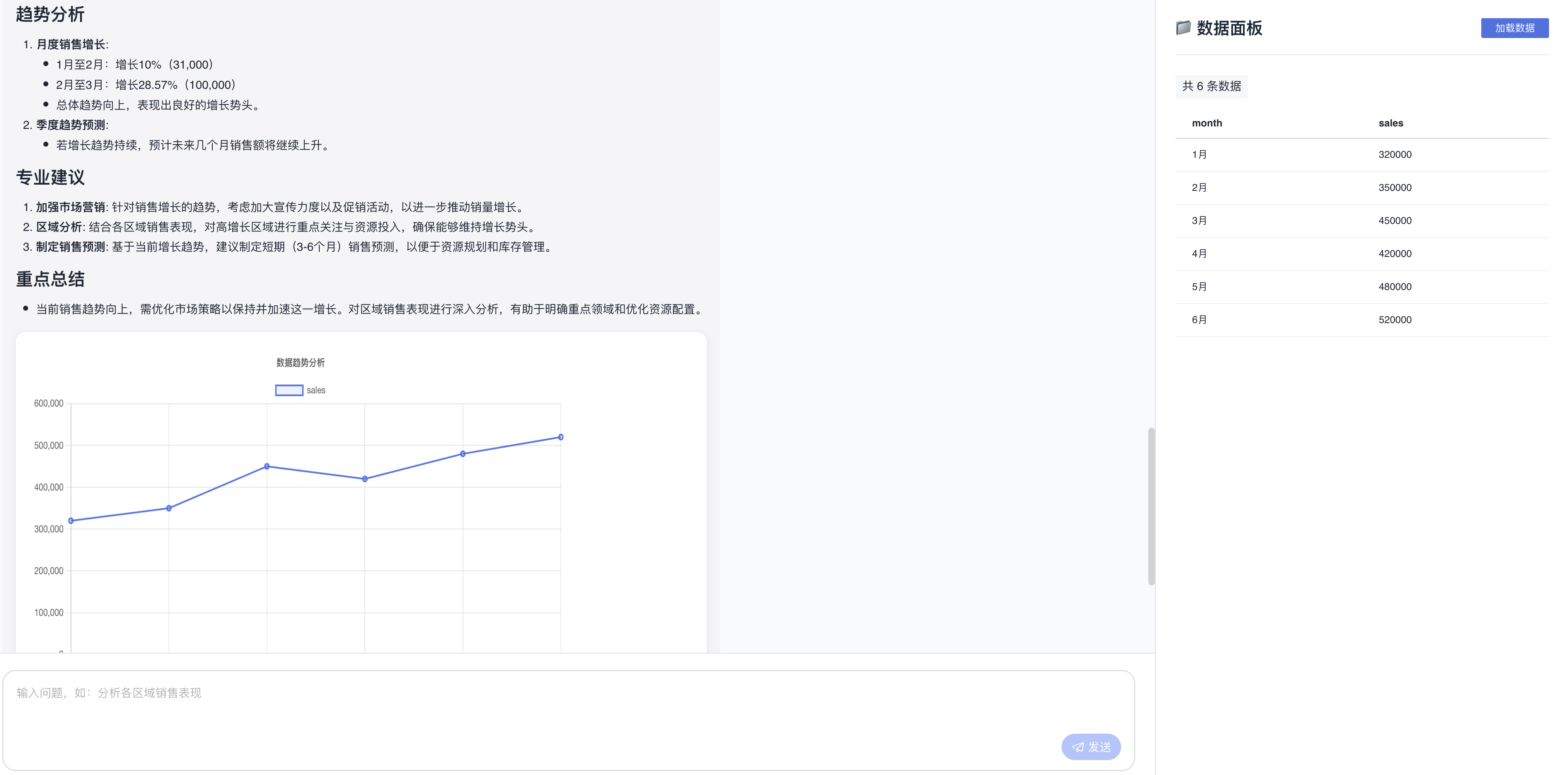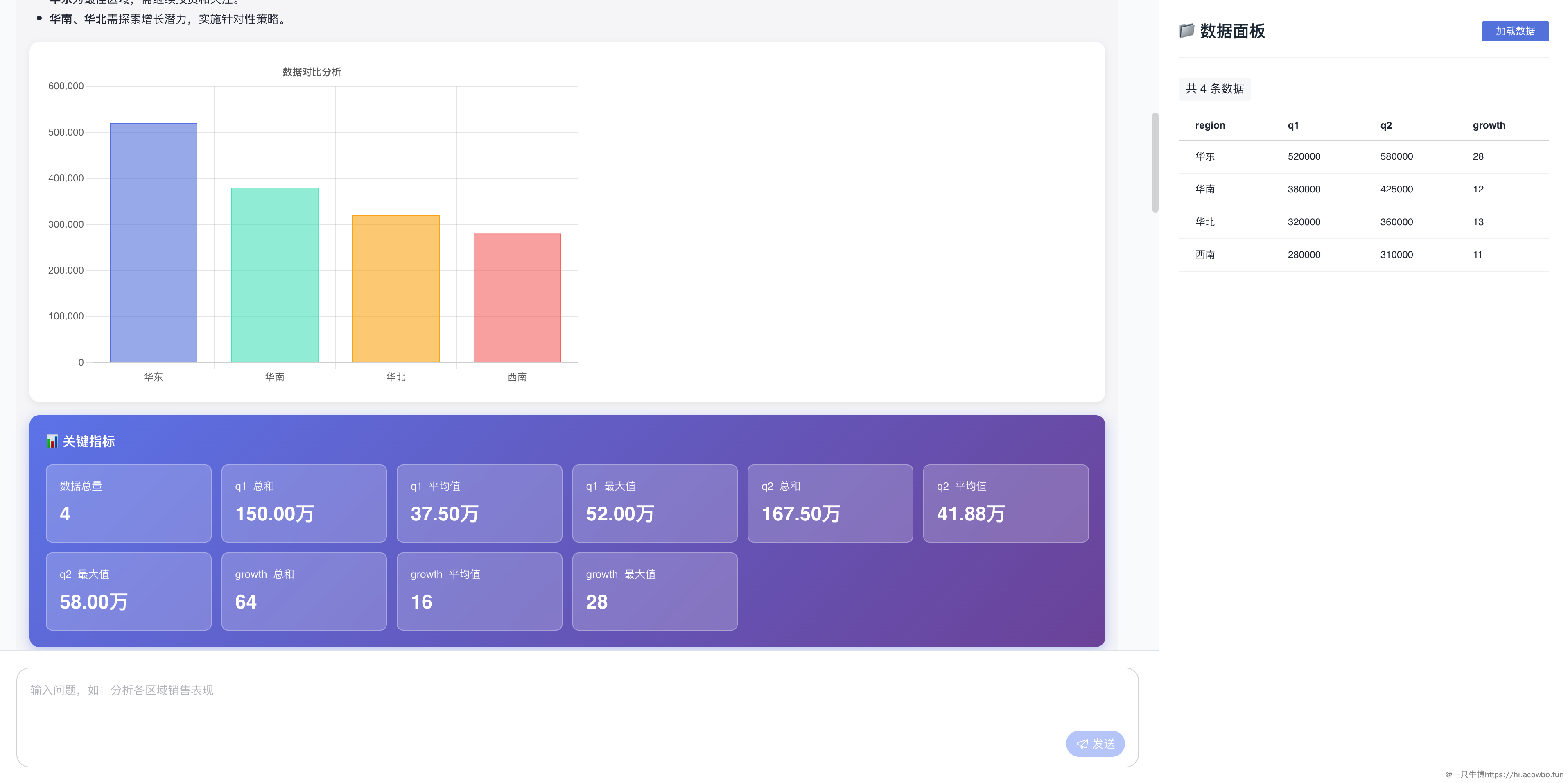 效果是什么样的?用户说一句"对比各区域销售表现",系统自动完成AI分析+图表生成+指标计算,2.5秒内返回包含文本解读、可视化图表和数据指标的完整分析结果。
