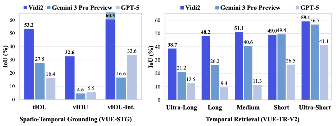具体来说,Vidi2在核心的时空定位任务上取得了压倒性优势,其衡量时空对齐精度的关键指标(vIoU-Int.)高达60.3%,几乎是GPT-5(33.6%)的两倍,更是远超Gemini 3 Pro Preview(16.6%)。