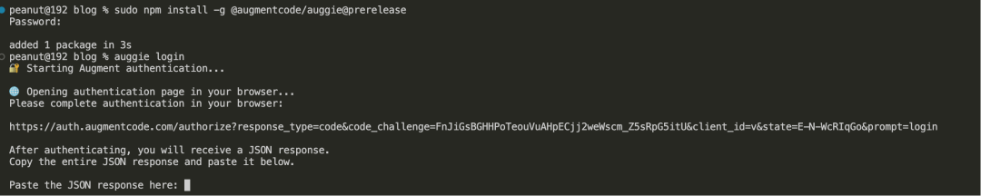 该指令会自动唤起浏览器,按照标准流程完成Augment账户认证。