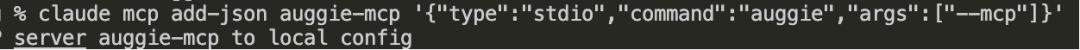 claude mcp add-json auggie-mcp '{"type":"stdio","command":"auggie","args":["--mcp"]}'