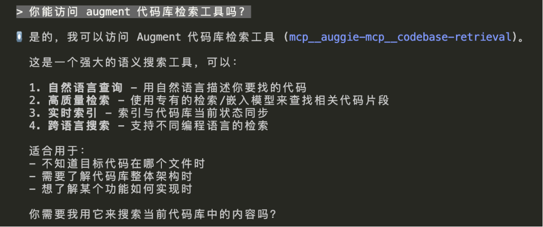 此时可在对话中通过调用auggie-mcp工具进行代码检索。