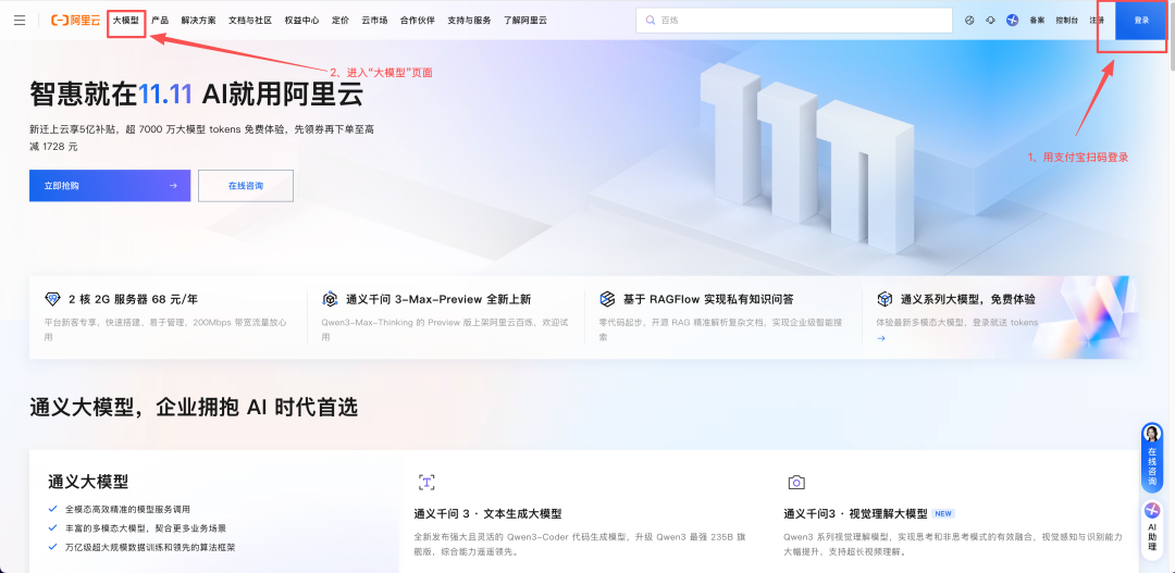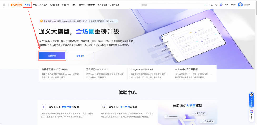 登录后,在页面左上角找到【大模型】选项,点击进入。