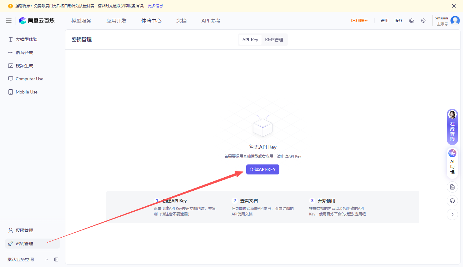 通过阿里云百炼获取免费API接口的流程相对简洁明了:注册登录 → 创建API密钥 → 配置模型保护 → 在工具中集成。