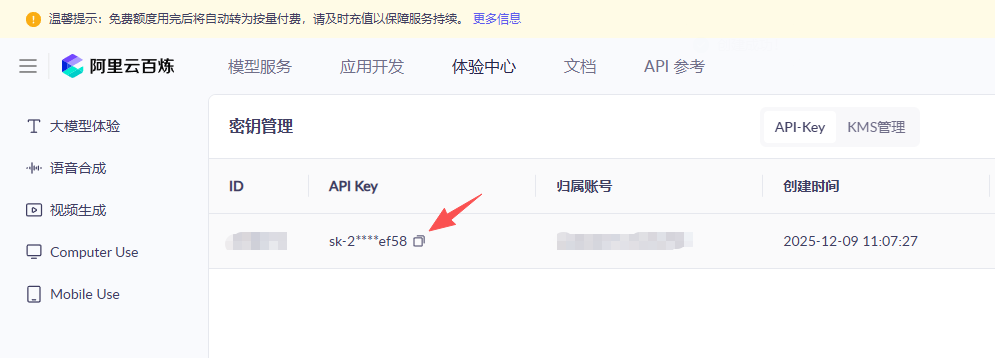 点击复制图标,将API Key保存至本地(建议使用密码管理工具妥善保管)。