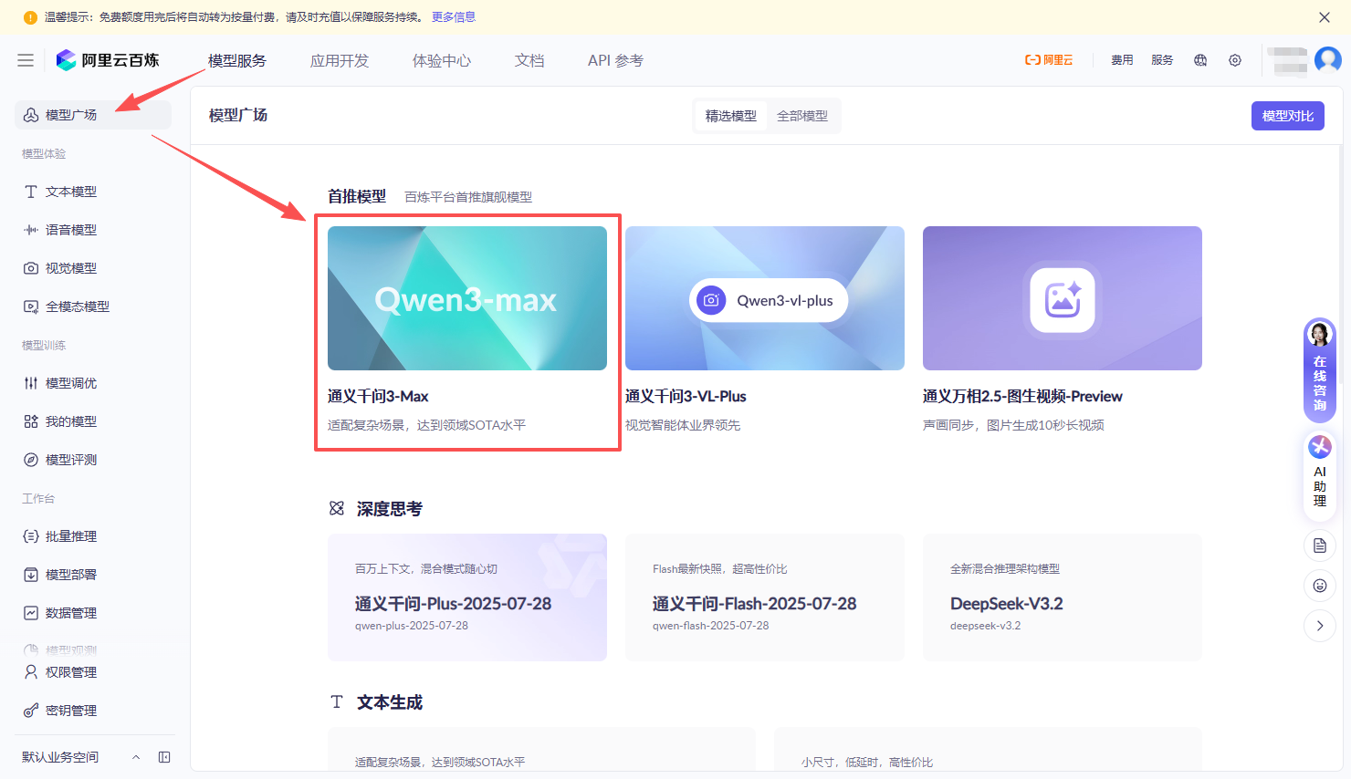 模型广场里有很多大模型,大家可以根据各自的需求挑选。常用的DeepSeek、Qwen、wan2.5等文生图、文生视频模型都有,并且100万Tokens的免费用量,个人用户日常使用绰绰有余。