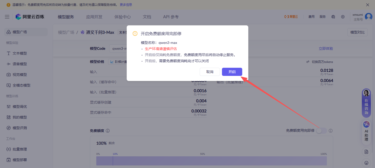 启用后,当月度免费Tokens用尽,免费额度用尽后平台将自动停止服务(返回403错误:AllocationQuota.FreeTierOnly.)