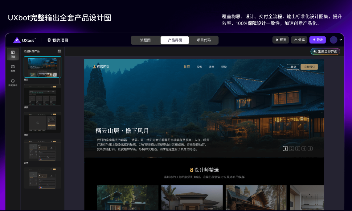 输入文字描述或上传参考图片,UXbot在10分钟内生成完整的多页面原型,包括页面流程、交互逻辑和视觉设计。这个过程涵盖了传统的产品、设计两个阶段。