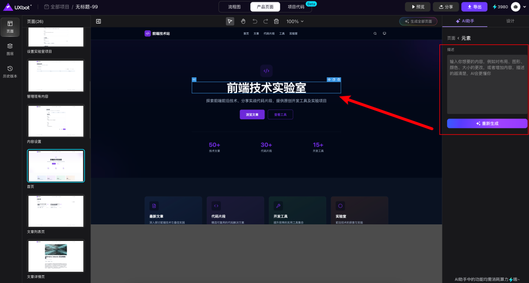 微调方法:选中不满意的页面元素 → 在右侧输入框描述需求 → UXbot重新生成该部分
