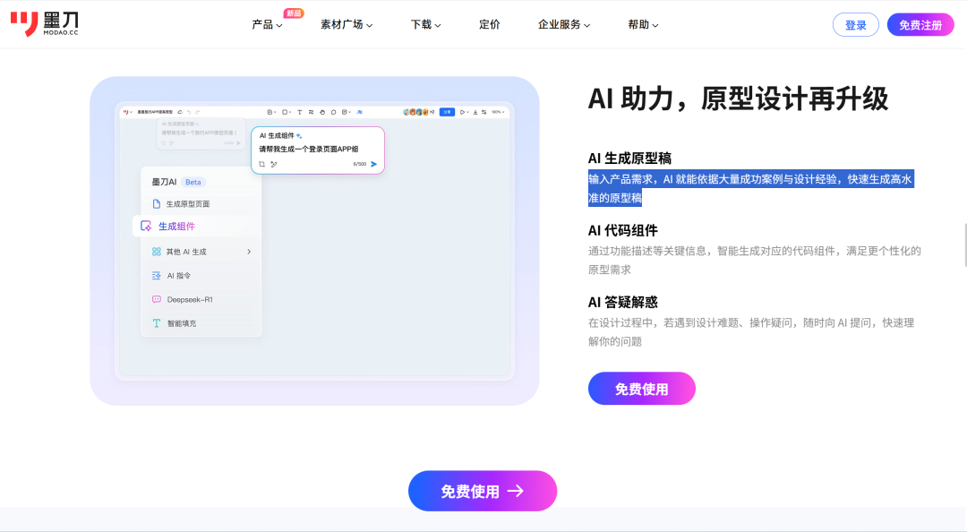 产品简介:国产原型设计工具,近期增加了AI设计原型功能。已有墨刀用户可直接体验新增的AI能力。