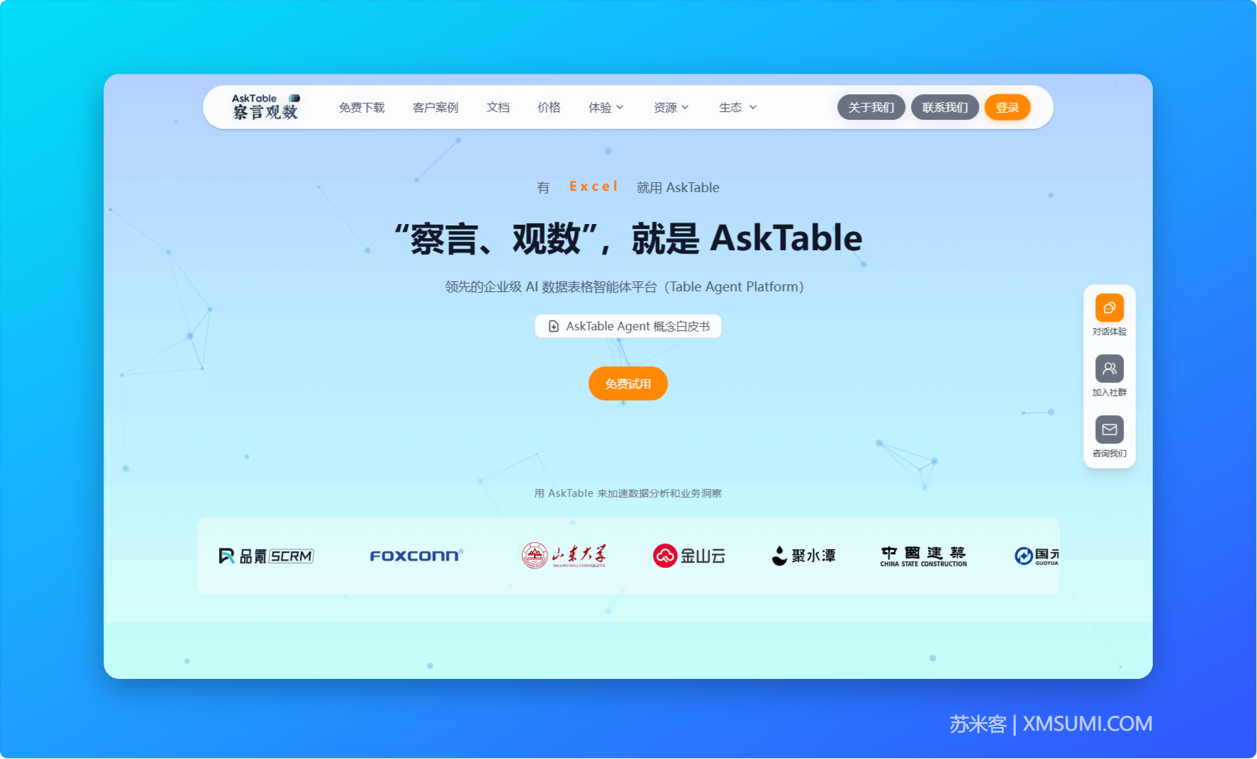 简介:企业级AI数据表格智能体平台,强调自然语言查询和办公软件集成。