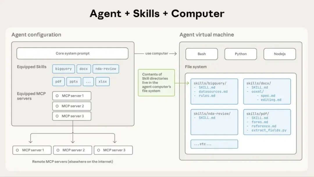 Claude Skills 解决了什么问题呢?一句话来讲,Claude Skills 是一种基于文件系统的、可复用的知识包,运行在 Claude 的沙盒虚拟机(VM)环境中,用于向 Agent 注入流程化、确定性的内部知识(SOP)的标准化方案。