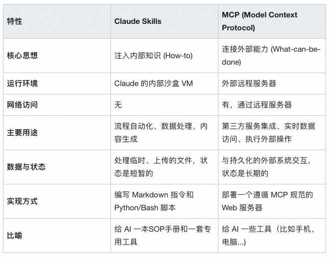 Claude Skills 和 MCP(Model Context Protocol)的定位不同但互补: