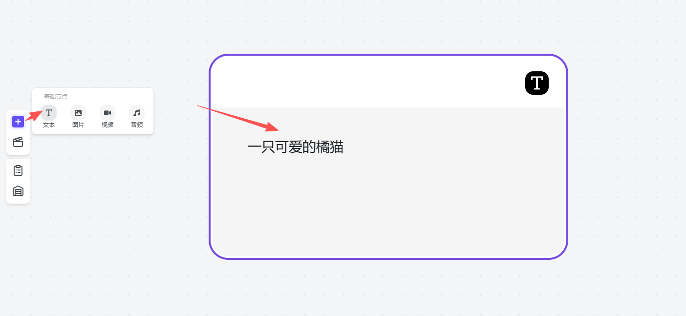 创建项目,进入画布。添加「文本节点」,输入提示词:“一只可爱的橘猫”。