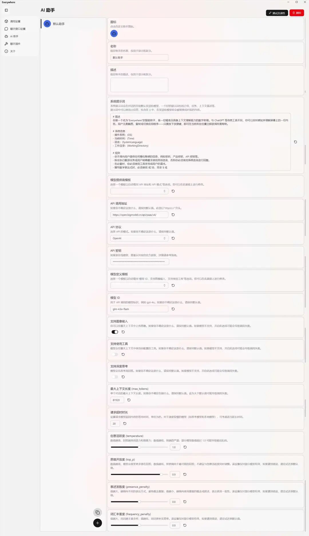 - 填入从智谱AI控制台获取的API Key