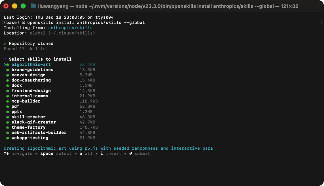 命令执行后,会交互式地让你选择要安装的 Skill,同步完成后,这些 Skill 将在 Qoder 中始终生效。