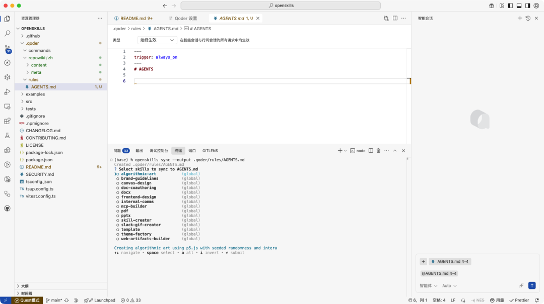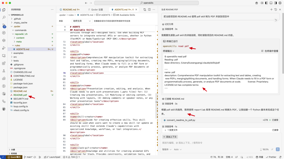 比如向 Qoder 输入指令:「把当前项目的 README.md 使用 pdf skill 转为 PDF 并放到项目中」,Qoder 会按照 AGENTS.md 规则中的指导,正确调用 pdf skill 将 README.md 转为 PDF 格式。