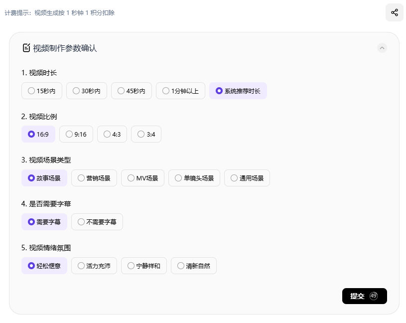生成过程需要视频制作参数确认,并自动生成分镜;