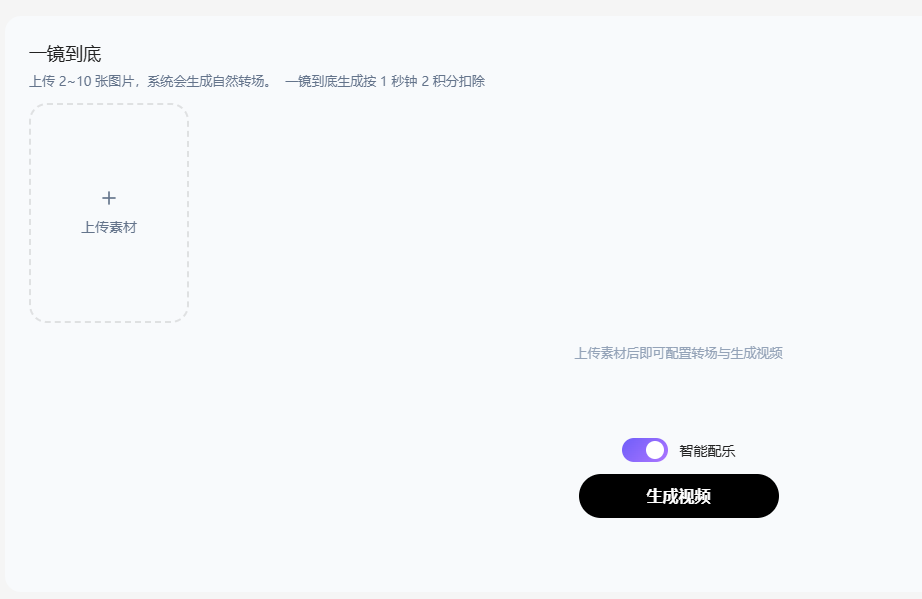 - 一镜到底生成:上传 2–10 张图片,自动生成自然转场与配乐,产出完整短片。