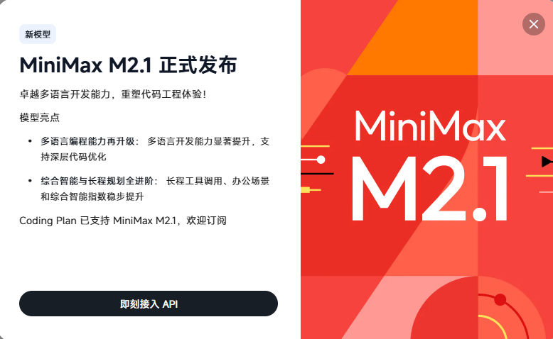 Coding Plan:支持使用 M2.1,价格不变(具体额度以官网为准)。