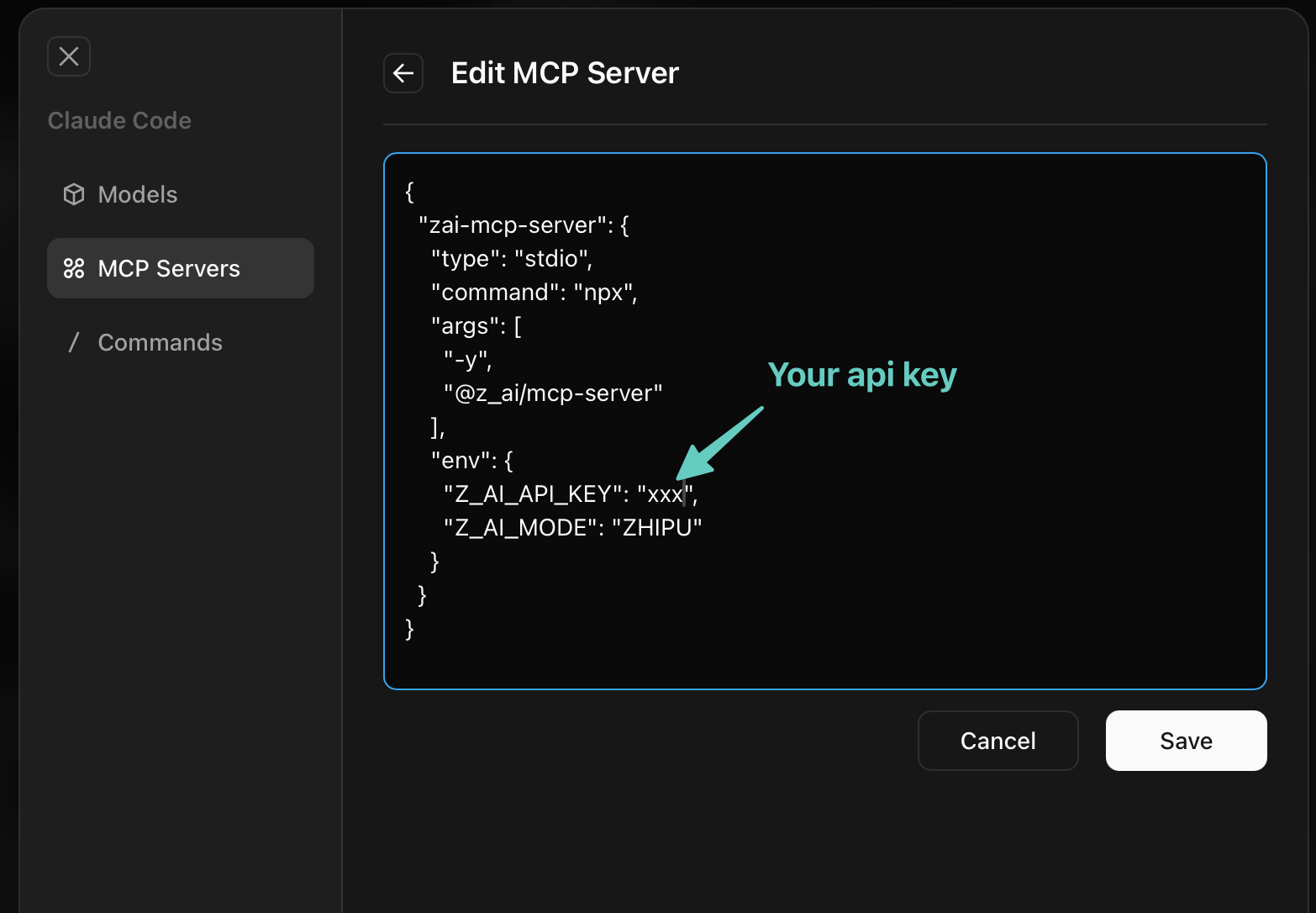 配置方法:在智谱API管理后台获取API Key,填入ZCode的MCP配置界面即可。
