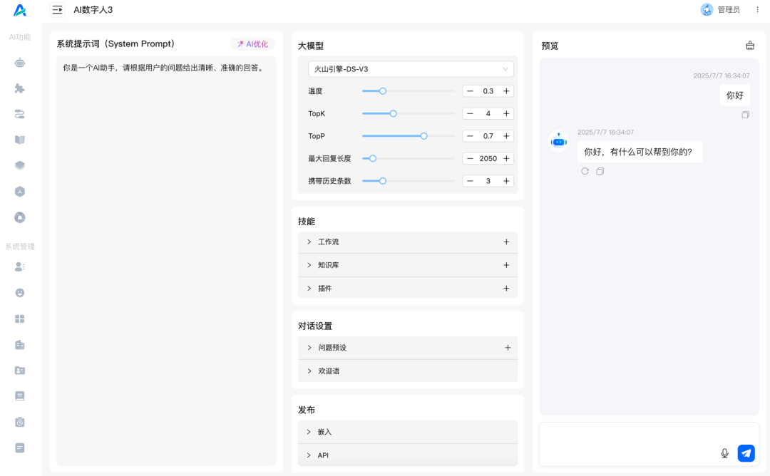 登录与基础设置:使用默认账号登录;配置模型供应商的密钥与推理参数(温度/最大长度/接口地址等)。