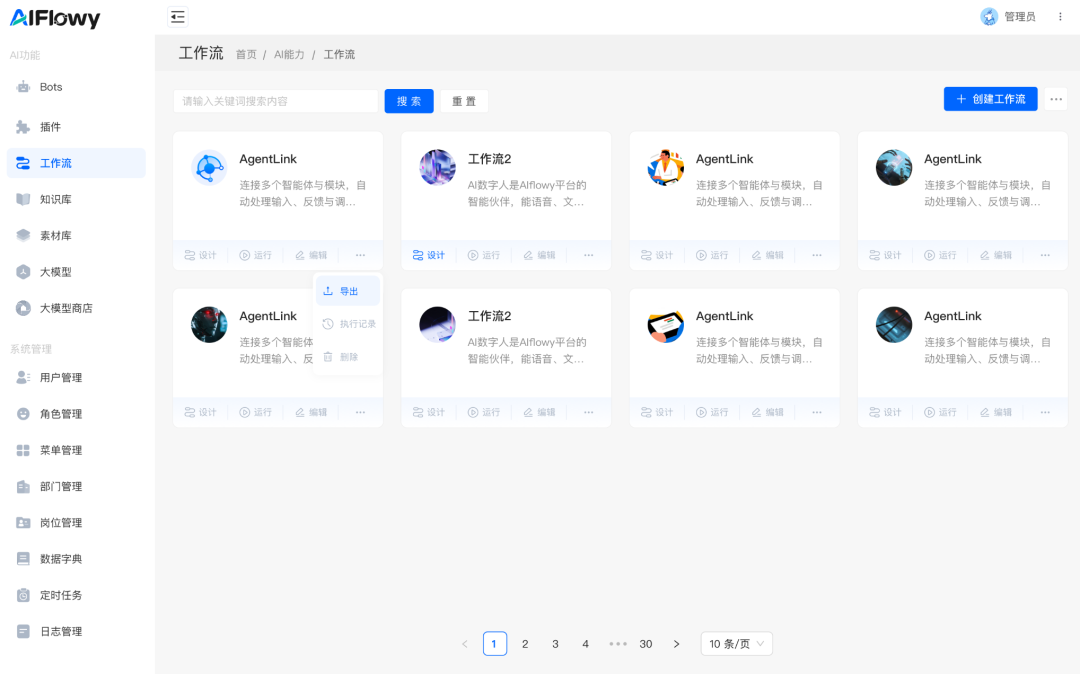 基于 Java 开发,支持智能对话机器人、私有知识库构建、AI 工作流编排和大模型管理等功能,提供完善的系统管理模块,满足企业级应用需求。