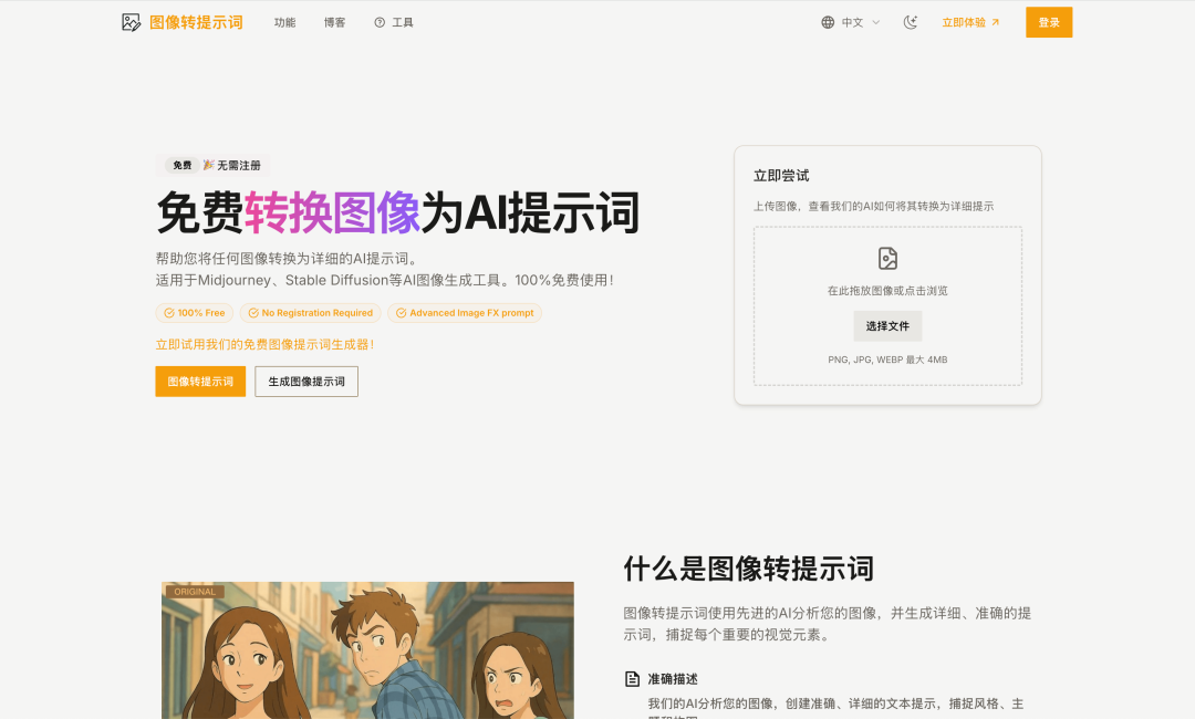 简介:一款无需注册的免费图片转提示词工具,主要用于快速反向工程图像内容。