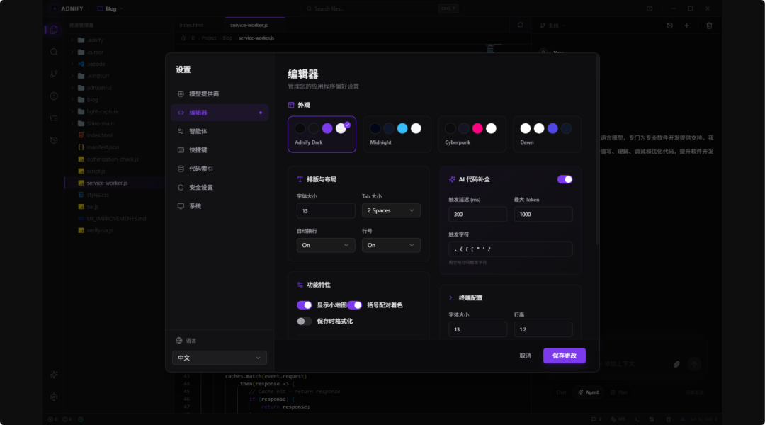 从功能定位上看,Adnify 不是简单的编辑器 + 插件组合,而是一个完整的工作环境:
