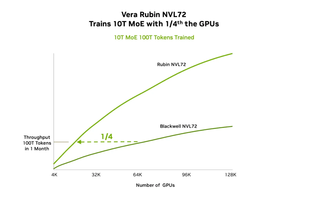 具体来看:训练一个 10 万亿参数的 MoE 模型,Blackwell 需要 64,000 张 GPU,而 Rubin 仅需 16,000 张